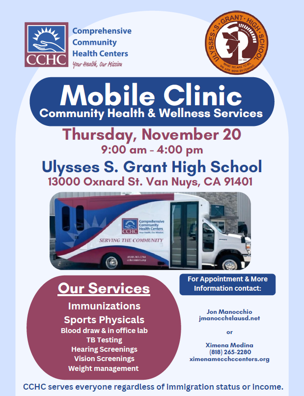 The Mobile Clinic is Coming! Thursday, Nov. 20th, 9AM-4PM Attached Files CCHC MOBILE CONSENT FORM__ LAUSD.pr 2025.pdf CCHC MOBILE CONSENT FORM__ Spanish.pdf